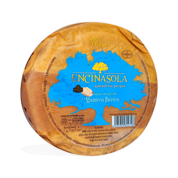 La corteza recubierta con manteca ibérica, siguiendo una técnica tradicional, contribuye a conservar sus propiedades durante la curación, aportando un toque graso y sabroso que complementa perfectamente su interior de pasta amarillo toscano.